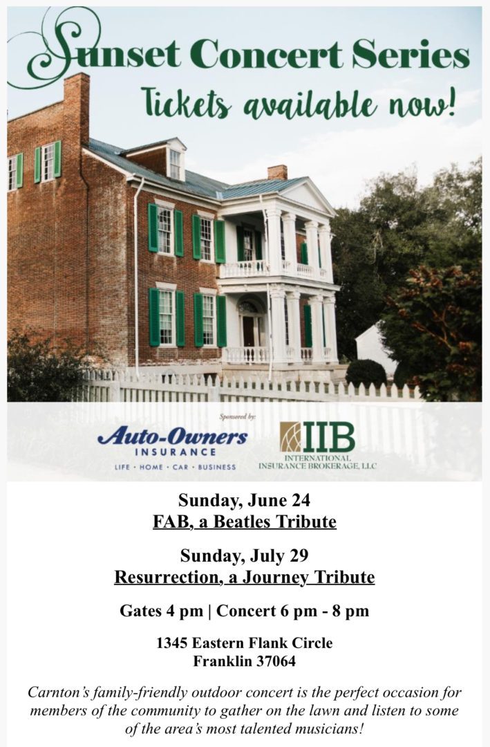 The Sunset Concert Series continued its 2018 season with music from Resurrection – A Journey Tribute. Over 2,000 attendees assembled on the east lawn next to Carnton for a Franklin summer evening, accompanied by beautiful weather and food offerings from Puckett’s Trolley, Maggie Moos ice cream, Cousins Maine Lobster and Kona Ice food trucks. Specialty drinks were offered, including margaritas provided by Chuy’s and mint juleps. The Sunset Concert Series raises funds for the Battle of Franklin Trust, which operates Carter House and Carnton. To learn more about the Battle of Franklin Trust, visit www.boft.org.