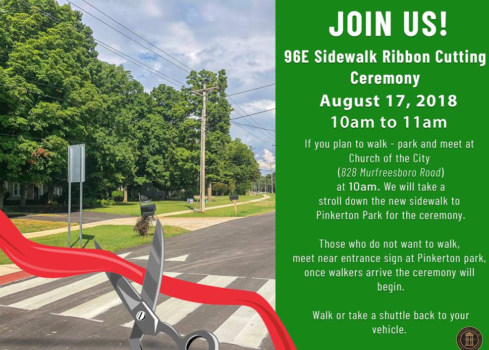Celebrate the grand opening of the 96E sidewalk. Get Fit Franklin and Franklin Mayor Ken Moore will park at Church of the City at 10am and walk down the new sidewalk to Pinkerton Park where there will be a short ceremony and ribbon cutting.