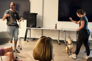 “The biggest thing is dogs going home,” said Caldwell. “Dogs are naturally sociable creatures, so we’re just trying to get them into playgroups, it is essential. Playgroup gives shelters the ability to use less people to attend to more dogs in a more confined period of time while providing enrichening experiences for the dogs.” Tio and Caldwell taught staff and volunteers about dog behavior, leash handling, and demonstrated techniques used to run safe and beneficial playgroups, the cornerstone of DPFL’s lifesaving programs.
