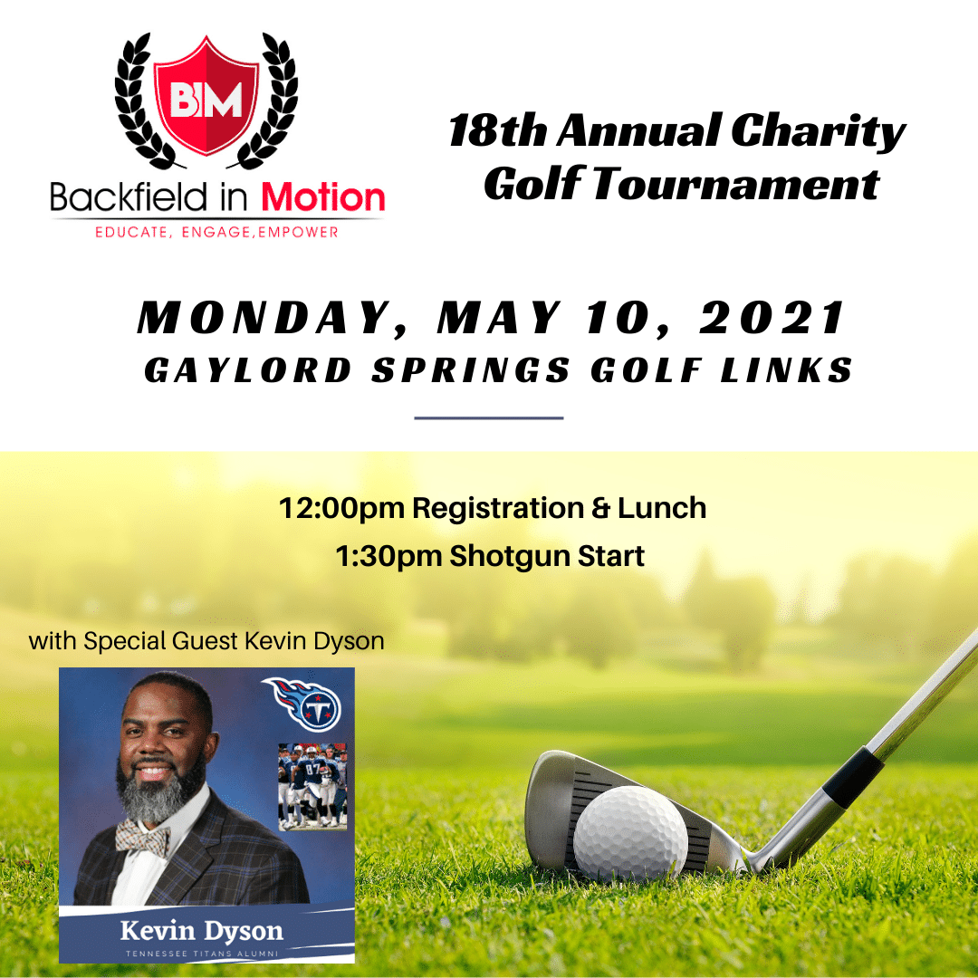 Join us on Monday, May 10th at Gaylord Springs Golf Links for Backfield in Motion’s 18th Annual Charity Golf Tournament with Kevin Dyson & Friends!