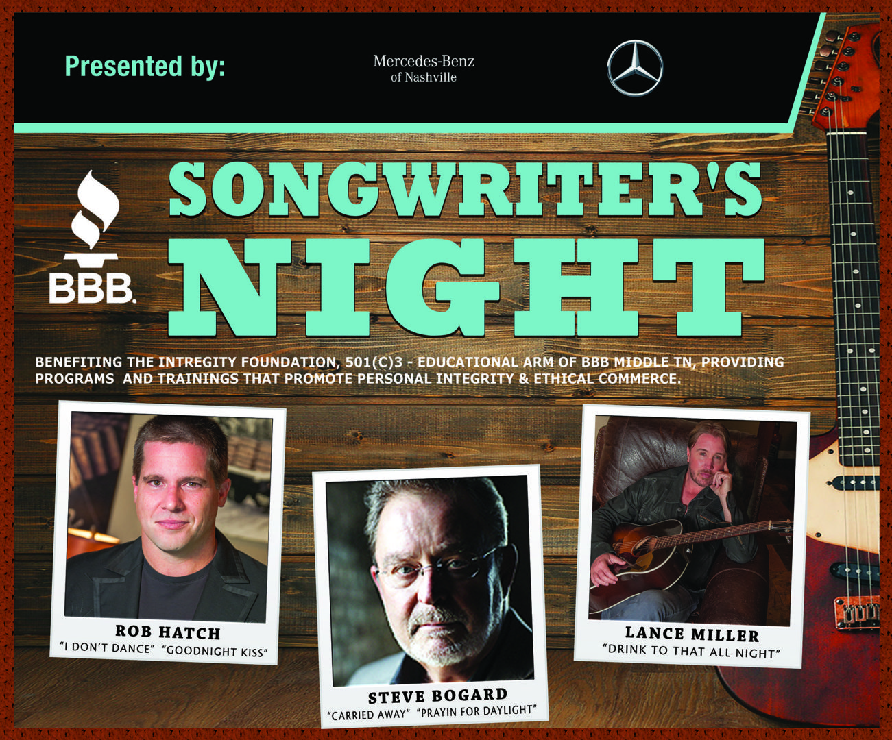 BBB Songwriters Night, presented by Mercedes-Benz of Nashville, is a fun musical event that spotlights the importance of integrity in the music industry. This event supports The Integrity Foundation’s mission to be the leading educational resource for all citizens in our community in order to support business success through marketplace ethics and personal integrity. Enjoy a fun filled night featuring a light dinner and delicious cocktails with stage performances from three of SESAC’s acclaimed Songwriters: BMI Award Winner Steve Bogard and 2014 SESAC Songwriters of the Year, Rob Hatch and Lance Miller. Purchase your tickets today as seating is limited!