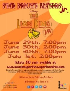 Performances of The Lion King Jr. are Friday, June 29 at 7:00 p.m., Saturday, June 30 at 2:00 p.m. and 7:00 p.m. and Sunday, July 1 at 2:00 p.m. in the Performing Arts Center at Academy Park, 112 Everbright Ave. in Franklin, TN. Tickets are $10 and are on sale at the door or online at www.academyparktn.wcparksandrec.com. Advance purchase is suggested. For more information, call (615) 786-0186, ext. 2518.