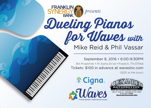 Join us for the 2nd Annual Dueling Pianos for Waves, presented by Franklin Synergy Bank! Chart-topping singer and songwriters Mike Reid and Phil Vassar will perform songs by request during this fun event. Come enjoy some yummy food, delicious drinks, incredible classic cars, and great music! This year’s event will feature both a live and silent auction. All proceeds benefit Waves.