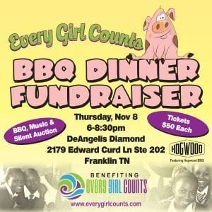 Every Girl Counts is committed to improving the lives of girls living in poverty by providing access to a high school education. They currently have a program of 70 students and intend to add 50 girls in 2019. On Thursday, November 8 Every Girl Counts will host an evening of artisan BBQ featuring local Franklin eatery Hogwood BBQ, live music, and a silent auction to raise funds for their Education Sponsorship Program. All proceeds give a girl a future with education.