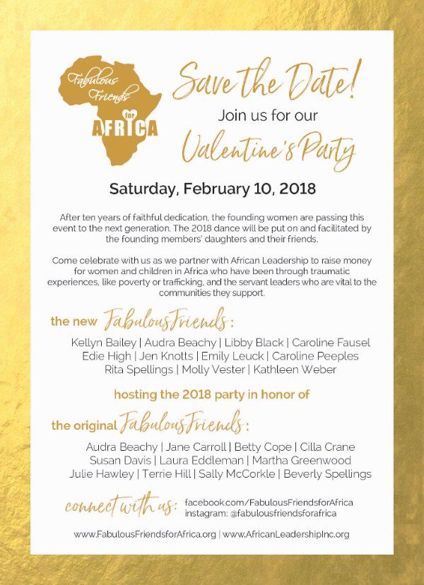 Fabulous Friends for Africa is a group of women who joined together to organize and sponsor a Valentine’s Dance to raise funds for African Leadership. After ten years of faithful dedication, the founding women took a step to pass this event to the next generation. The 2018 dance will be put on and facilitated by the founding members’ daughters and their friends, in an effort to keep the dream and goal of the event alive for years to come.