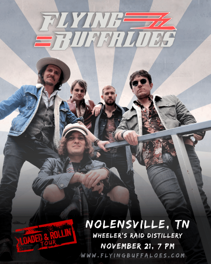 One of Nashville’s hottest alt-country/roots rock bands, Flying Buffaloes, are preparing to descend on Nolensville, TN in celebration of the one-year anniversary of their critically-acclaimed debut album, LOADED & ROLLIN’. The band will deliver their signature high-voltage live performance set at Wheeler’s Raid Distillery (2007 Johnson Industrial Park Bldg. C) on November 21 at 7:00 p.m. Tickets for this event are $15.