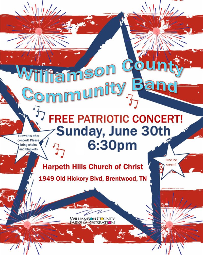 The Williamson County Community Band will kick-off 4th of July celebrations with a free concert showcasing favorite Americana melodies. Come join the fun at Harpeth Hills Church of Christ, 1949 Old Hickory Blvd., in Brentwood, TN on Sunday, June 30 at 6:30 p.m. Free ice cream and a fireworks show will conclude the evening’s festivities. Bring lawn chairs and blankets for seating.
