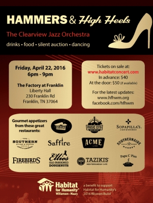 Habitat for Humanity Williamson-Maury – Friday, April 22, 2016 from 6:00 PM to 9:00 PM (CDT) – Franklin, TN