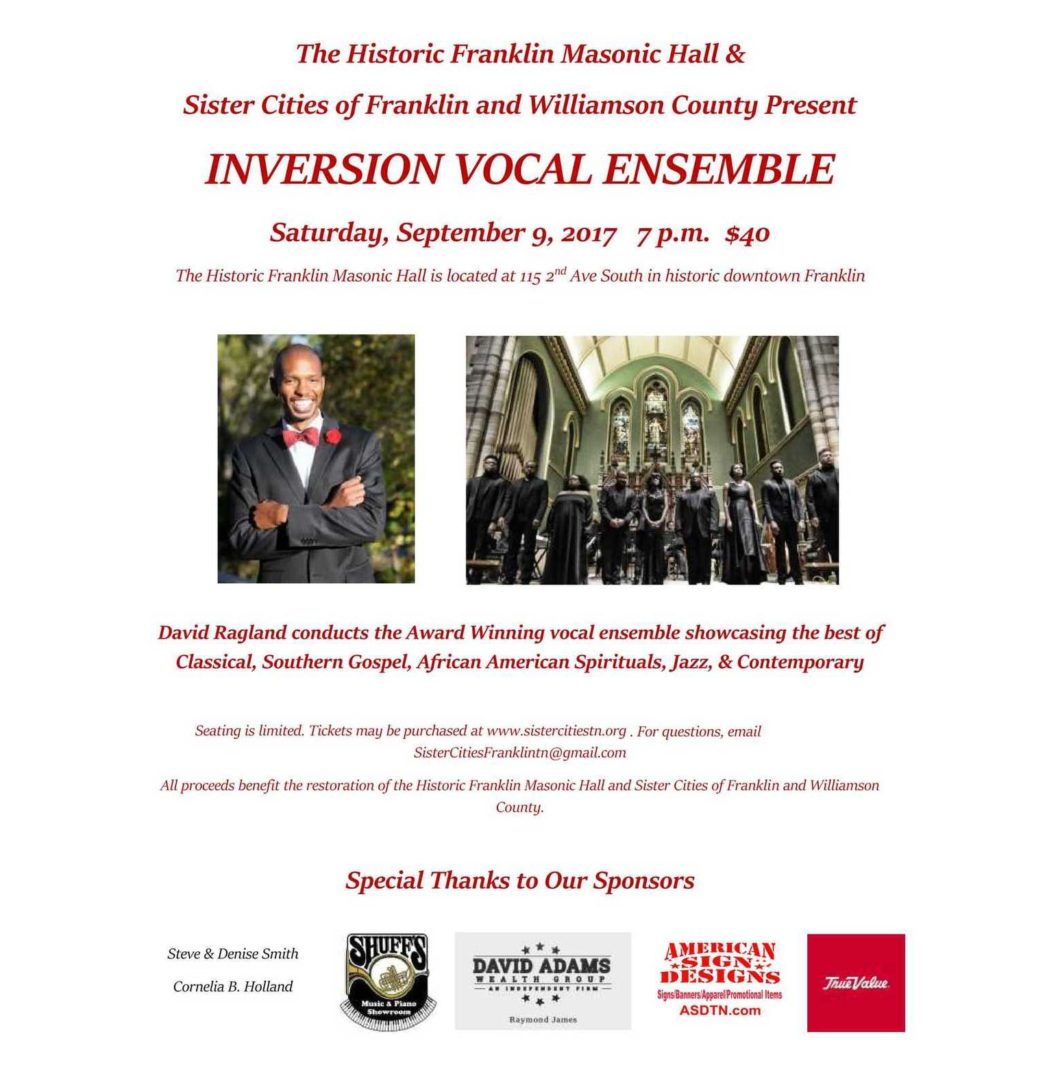 The Historic Franklin Masonic Hall & Sister Cities of Franklin and Williamson County Present INVERSION VOCAL ENSEMBLE Saturday, September 9, 2017 7 p.m. The Historic Franklin Masonic Hall is located at 115 2nd Ave South in historic downtown Franklin, TN. David Ragland conducts the Award Winning vocal ensemble showcasing the best of Classical, Southern Gospel, African American Spirituals, Jazz, & Contemporary.