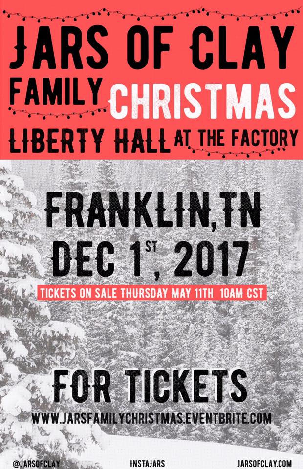 Multi-platinum, multi-Grammy winning band, Jars of Clay bring their highly anticipated Family Christmas Show back to Franklin, TN. An evening of Christmas classics, fan favorites, and musical collaborations with old and new friends, sure to get everyone into the Christmas spirit! Special guests announced so far: Grammy-winning singer/songwriter Ashley Cleveland & The AMAZING quartet of sisters known as SHEL!