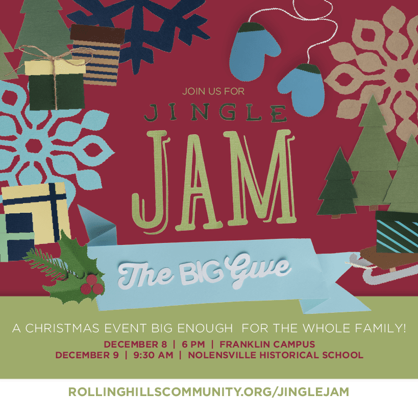 Grab your kids, your parents, your friends, your neighbors…and step into an unforgettable Christmas experience with us, at Jingle Jam: The Big Give. We know the holiday season can get busy, so we’ve created an evening for your family to just simply be together, sing songs, play crazy games, laugh til your sides hurt, and hear the Christmas story told in a way that engages every age. Jingle Jam is dedicated to your family and your mission to keep Jesus at the center of the celebrating this Christmas. We truly cannot wait to share this experience with you.