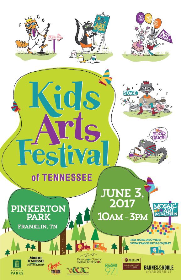 The third annual Kids Art Festival of Tennessee is brought to you by the City of Franklin Parks and the Williamson County Cultural Arts Commission. The Kids Art Festival of Tennessee is calling all elementary, middle, and high school artists, dancers, musicians, vocalists, thespians, poets, photographers, and artisans to participate. This free festival is open to the public and will take place on Saturday, June 3, 2017 from 10 AM – 3 PM in Pinkerton Park across the footbridge from Historic Downtown Franklin, TN.
