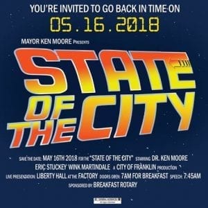 Mayor Ken Moore will give his eighth State of the City presentation at the Factory in Franklin at Liberty Hall on Wednesday, May 16, at 7:45 a.m. Doors open at 7:00 a.m.; light breakfast, sponsored by the Franklin Breakfast Rotary, will be provided. City Departments will have tables and booths set up to show off the City’s services and accomplishments in the past year.