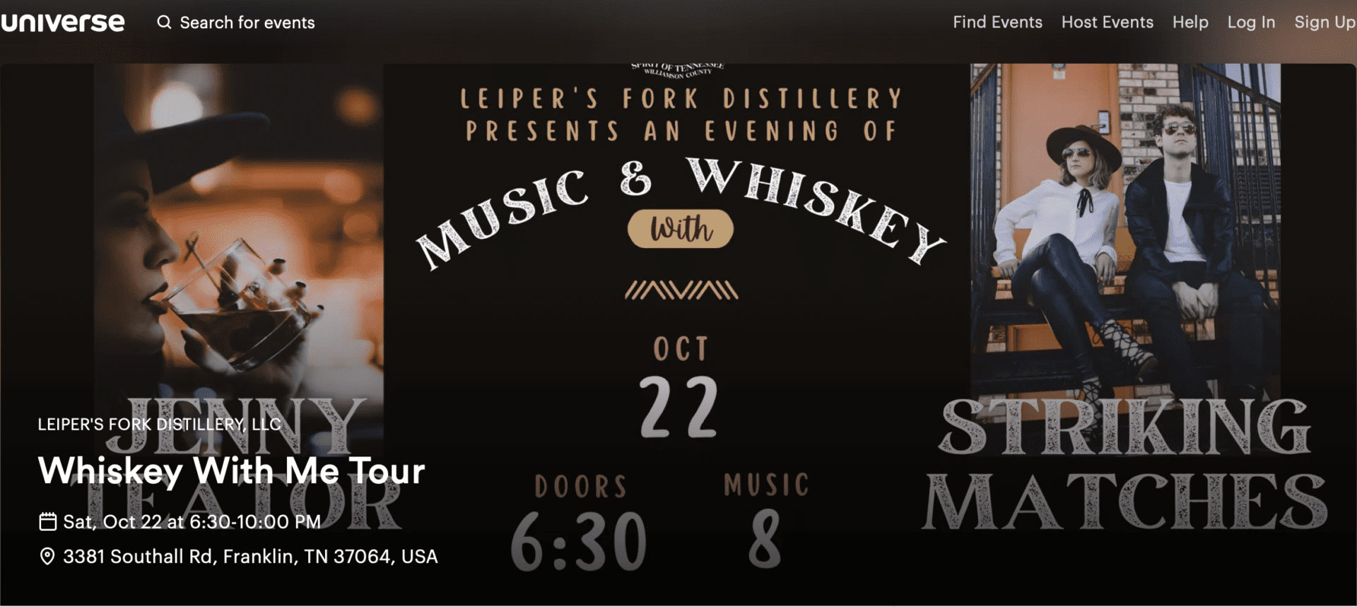 Come join us for a Stillhouse Sessions at Leiper’s Fork Distillery featuring Jenny Teator “Whiskey With Me” Kickoff Tour and duo Striking Matches.