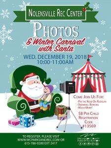 Santa Claus will be at the Nolensville Recreation Center to visit children, hear their wish lists and take a commemorative picture. Photos will be printed on-site. Winter carnival games will be set-up in the gym for little ones to enjoy, including pin the tail on the reindeer, snowball bowling and so much more. Cost: $8 per child and $6 for each additional child. Online registration at www.wcparksandrec.com. Registration code: #13569