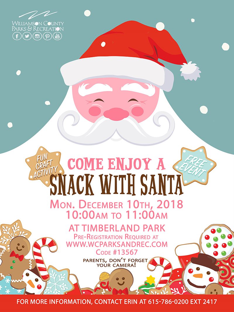 Monday, December 10: Snack with Santa, 10:00-11:00 a.m. – Timberland Park, Franklin, TN.
