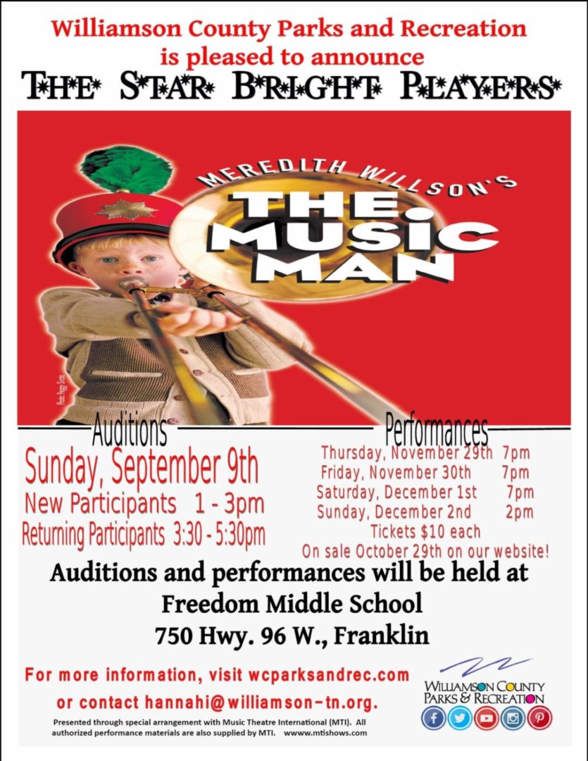 Williamson County Parks and Recreation is pleased to announce The Star Bright Players in Meredith Wilson’s The Music Man! Presented through special arrangement with Music Theatre International (MTI). All authorized performance materials are also supplied by MTI. www.mtishows.com. Auditions and performances will be held at Freedom Middle School, 750 Hwy. 96 W., Franklin, TN. Visit WCPR for more information.