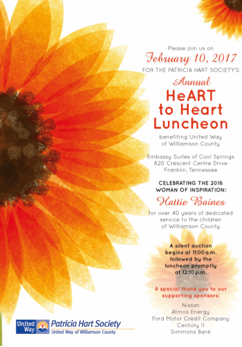 The Patricia Hart Society Annual HeART to Heart Luncheon combines stories of inspirational women, a fabulous silent auction and delicious lunch all to support the work of United Way of Williamson County in removing barriers to learning, supporting the community’s most vulnerable and reducing burdens of financial need.