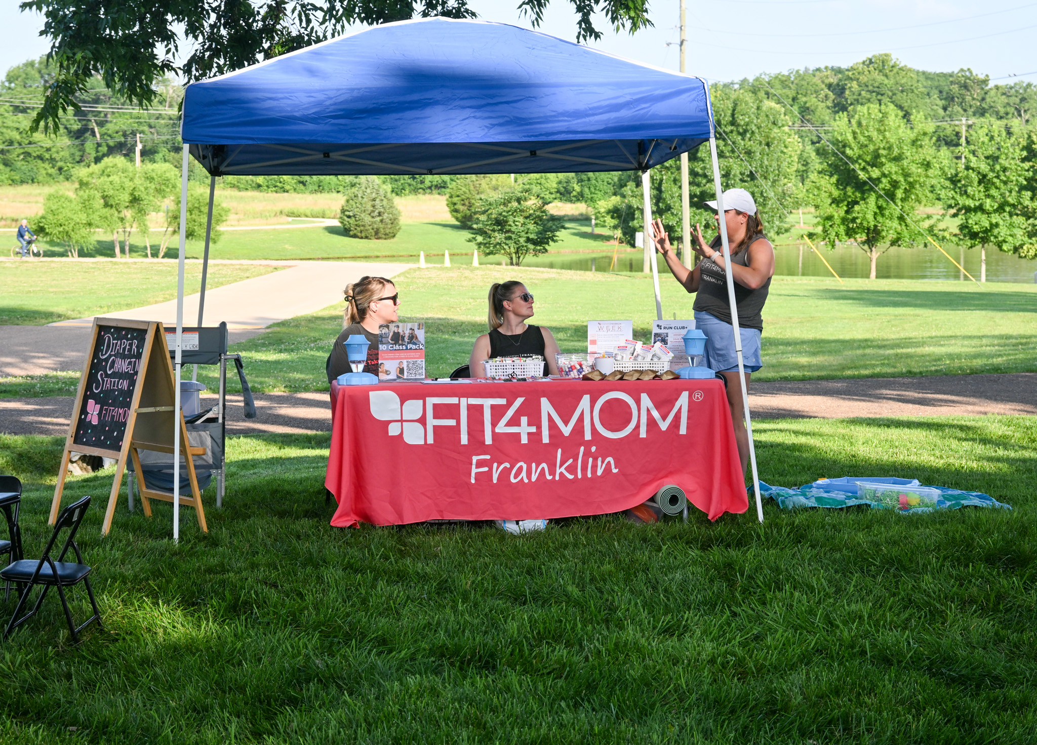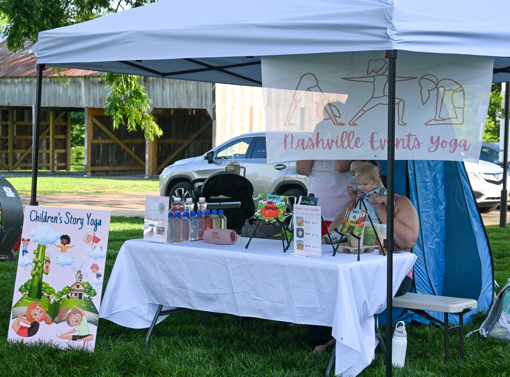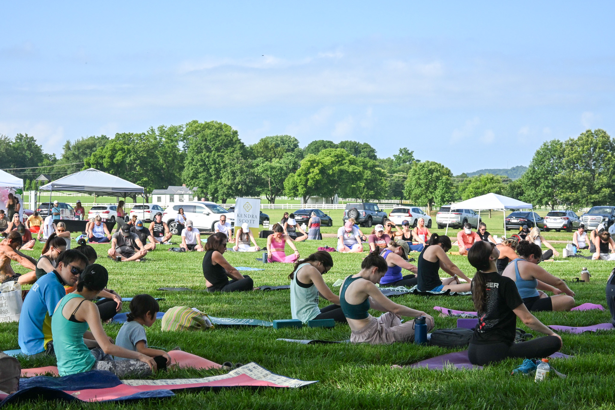 Vendors and sponsors included a mix of fitness studios, health coaches, family wellness businesses, holistic practitioners, and lifestyle brands. Guests stopped by booths from BODY20 Franklin, Sounds of the Soul & Reiki PT, Fit4MOM, Heart Space Vibes, Southern Belle Birdies, Tiny Spoon Chef, Kendra Scott, Vuori Clothing, and other local vendors who shared resources and offerings throughout the day. The atmosphere was relaxed, with visitors lingering after class to connect with instructors, browse sponsor displays, and explore local organizations.