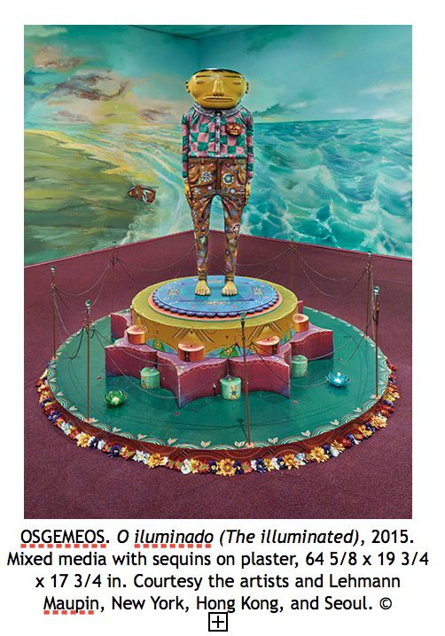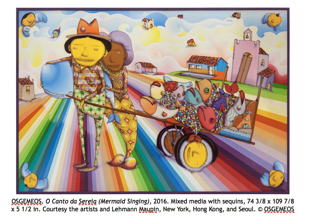 OSGEMEOS: In between features eight mixed-media paintings and two sculptures. Many of the works are populated with large-headed, long-limbed yellow figures in whimsical settings. The works tell stories—sometimes autobiographical—of fantasy, family, social change, and how tradition and progress coexist in Brazil.