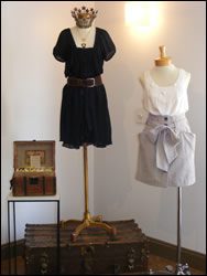 In the second photograph the mannequin on the left is wearing a versatile navy Graham and Spencer navy dress. The dress is cinched with a Shanllee brown belt for a more casual look, and Gorgona gold necklace completes the outfit. The mannequin on the right is wearing an airy white Mint blouse and a blue Dolan seersucker skirt.