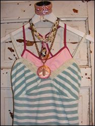 The second outfit is a Z-Brand blue and gray striped tank top, layered over a pink Free People racer back tank top. The basic tops are dressed up with an Avindy necklace, M.E. Moore necklace, and an awesome Lenora Dame bug gem pendant necklace. Amrita Singh mirrored bangles pull together the look.