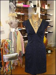 The first dress pictured is an elegant Nicole Miller navy v-neck dress, a Julie Feldman silver purse, and a necklace with five layers.