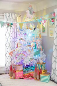 Last year, the adoption and foster care advocate transformed the room in to a Christmas wonderland for her kids. Jenny states, “I just wanted to create a celebratory space for Christmas in an area we gather in as a family. Using colorful bulbs inside a white tree, I created an ombre effect within the tree and then accented with traditional pastel bulbs, glass bulbs and paper mache unicorns. I love having a designated themed tree for children because I think it just makes the holidays a bit more special.” For more Jenny design inspiration, follow her on Instagram @jennyreimold.