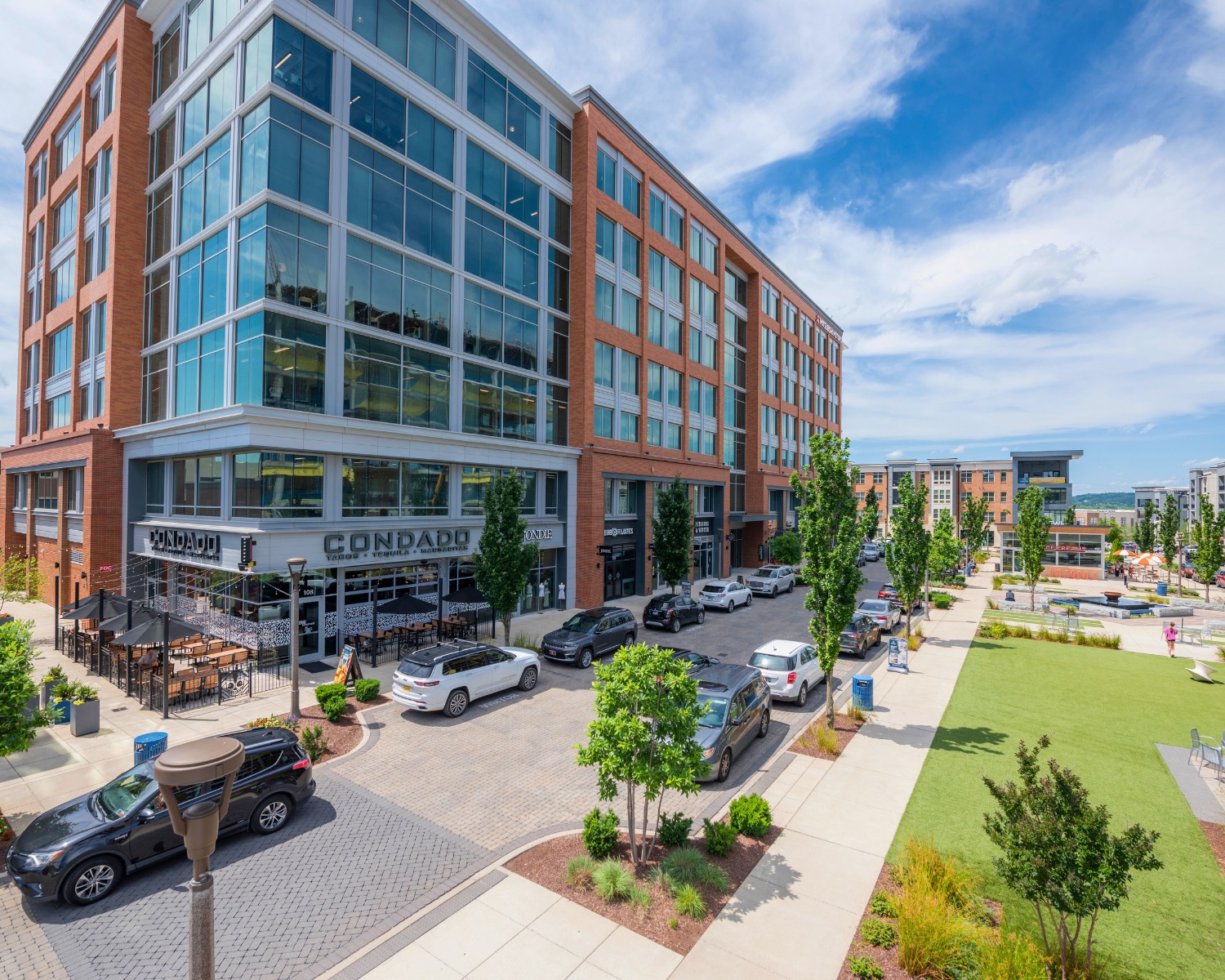 Once you’re parked, wide sidewalks and pedestrian crossings connect each part of the development. It’s easy to move between restaurants, shops, offices, and the central green space designed for community gatherings, outdoor concerts, and seasonal events. In addition, many of the buildings have patios and outdoor seating that encourage people to spend time outside.