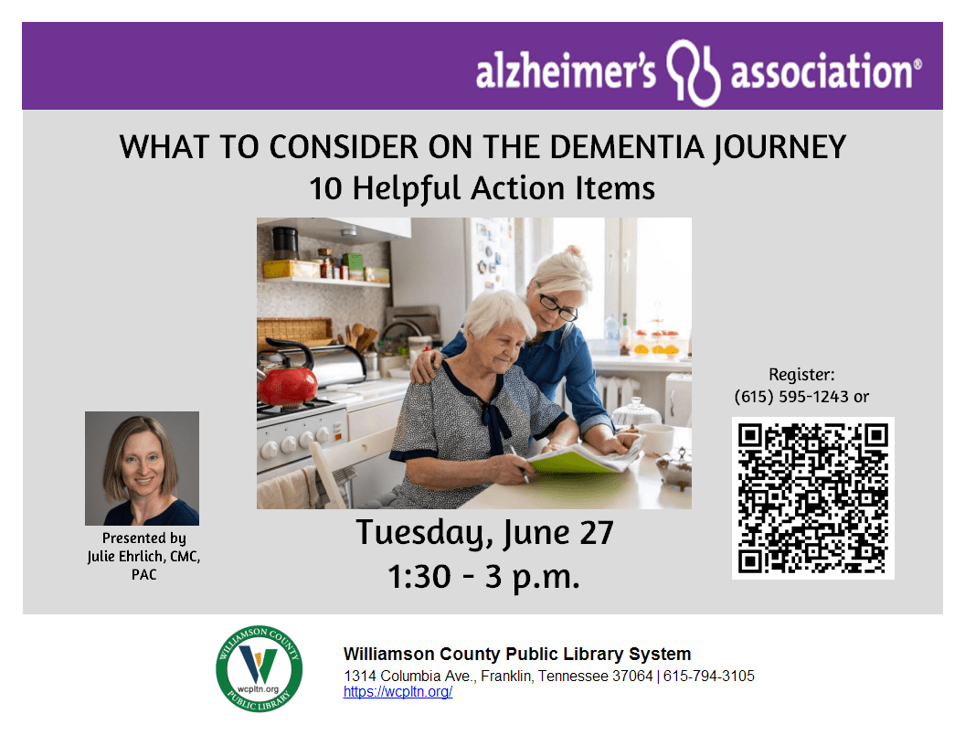 Williamson County Public Library - Franklin 1314 Columbia Avenue, Franklin, TN, United StatesThe Williamson County Public Library and the Alzheimer’s Association Tennessee Chapter are pleased to announce the third program in their […]