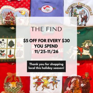 - The Find | Black Friday and Small Business Saturday: The secondhand and vintage clothing boutique will be offering $5 off for each $30 spent on both Black Friday and Saturday.